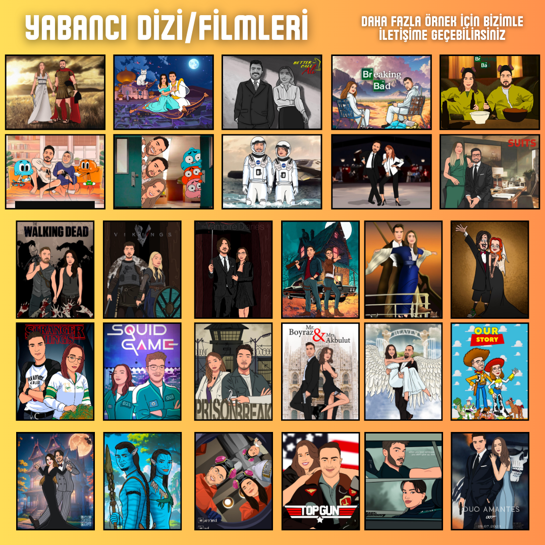 Filmler : Harry Potter, Marvel/DC, Yüzüklerin Efendisi, Game Of Thrones, Star Wars, The Office, Friends, HIMYM, İstediğiniz Türk ve yabancı bütün dizilere sizleri uyarlayabiliriz.